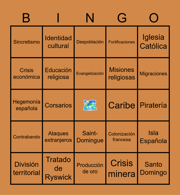 This bingo card has a free space and 25 words: Contrabando, Ganadería, Piratería, Tratado de Ryswick, Fortificaciones, Sincretismo, Despoblación, Iglesia Católica, Corsarios, Colonización francesa, Crisis económica, Evangelización, Santo Domingo, Ataques extranjeros, Misiones religiosas, División territorial, Producción de oro, Migraciones, Educación religiosa, Caribe, Hegemonía española, Saint-Domingue, Isla Española, Identidad cultural and Crisis minera.