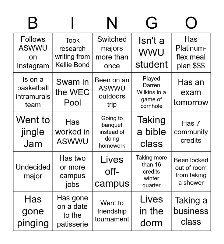 This bingo card has a free space and 29 words: Has gone pinging, Is taking a class from Tiago, Has worked in ASWWU, Brought a date to banquet, Follows ASWWU on Instagram, Switched majors more than once, Swam in the WEC Pool, Has two or more campus jobs, Taking a bible class, Has gone on a date to the patisserie, Has 7 community credits, Taking a business class, Went to friendship tournament, Lives in the dorm, Has an exam tomorrow, Has been to banquet before, Lives off-campus, Undecided major, Has Platinum-flex meal plan $$$, Went to jingle Jam, Taking more than 16 credits winter quarter, Follows president Bryan on Instagram, Played Darren Wilkins in a game of cornhole, Is on a basketball intramurals team, Isn't a WWU student, Took research writing from Kellie Bond, Been locked out of room from taking a shower, Been on an ASWWU outdoors trip and Participated in Midnight scream.