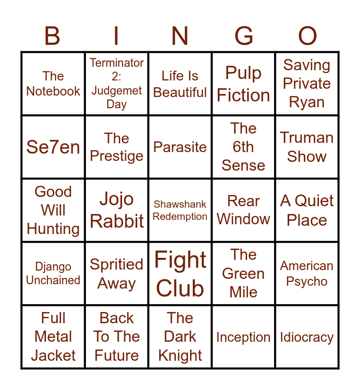 This bingo card has a free space and 24 words: Spritied Away, Back To The Future, Parasite, Full Metal Jacket, Saving Private Ryan, The Notebook, Se7en, Terminator 2: Judgemet Day, Rear Window, Fight Club, The 6th Sense, Good Will Hunting, The Green Mile, American Psycho, The Prestige, Inception, A Quiet Place, Life Is Beautiful, Truman Show, Jojo Rabbit, Idiocracy, Django Unchained, Pulp Fiction and The Dark Knight.