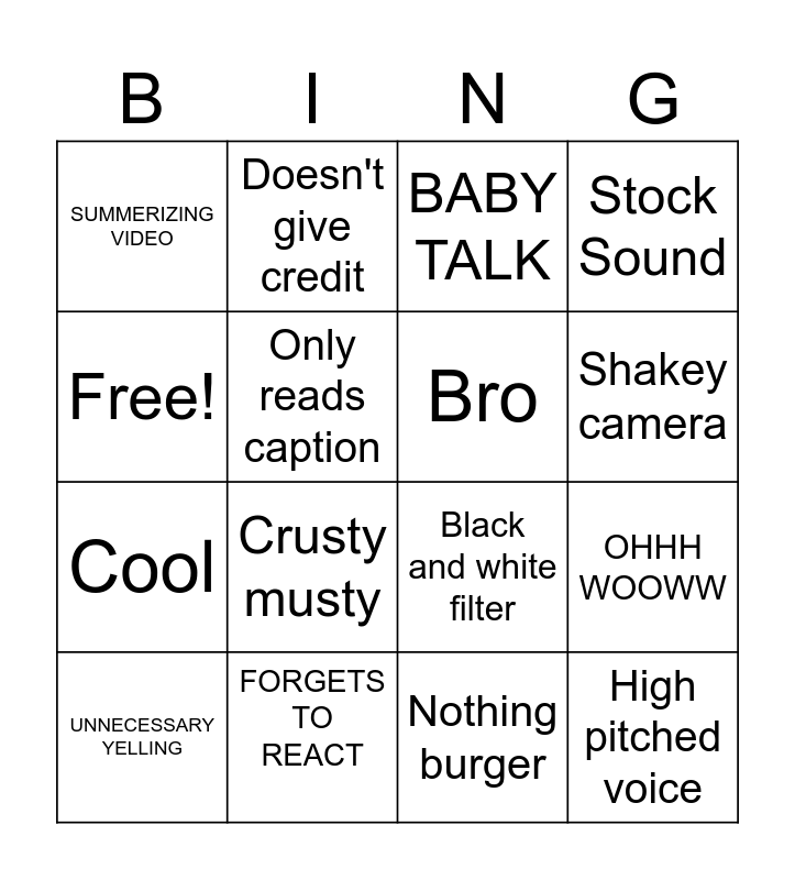 This bingo card has 16 words: FORGETS TO REACT, OHHH WOOWW, BABY TALK, SUMMERIZING VIDEO, Cool, Doesn't give credit, Black and white filter, Nothing burger, Free!, Only reads caption, UNNECESSARY YELLING, Stock Sound, Crusty musty, Shakey camera, Bro and High pitched voice.