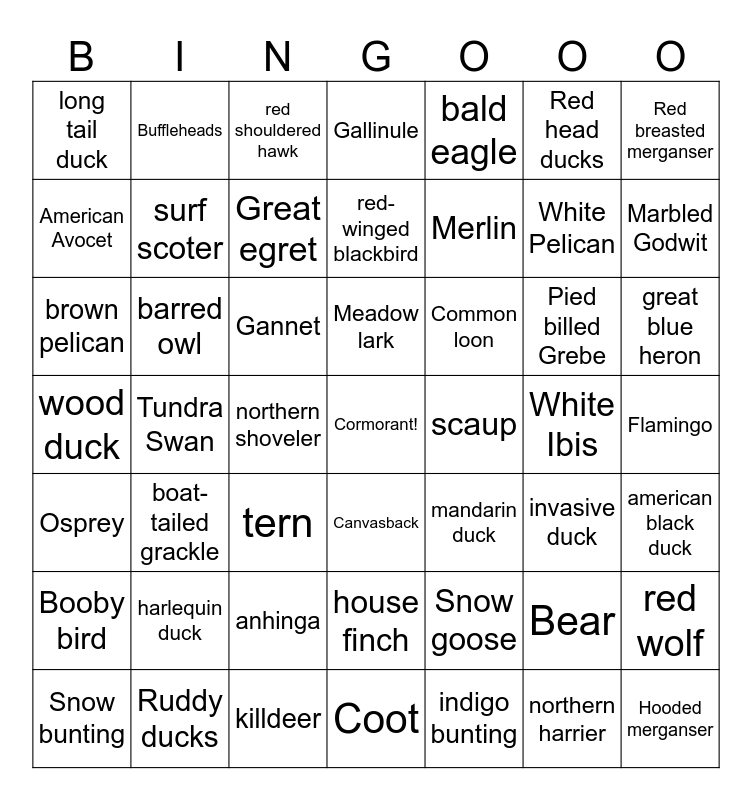 This bingo card has a free space and 48 words: Snow goose, White Pelican, Coot, Tundra Swan, Gannet, Flamingo, Buffleheads, Ruddy ducks, Red head ducks, Canvasback, Red breasted merganser, Gallinule, Pied billed Grebe, Common loon, Booby bird, White Ibis, American Avocet, Marbled Godwit, Bear, bald eagle, Merlin, northern shoveler, long tail duck, surf scoter, red wolf, Great egret, great blue heron, Snow bunting, Meadow lark, barred owl, northern harrier, scaup, american black duck, harlequin duck, wood duck, mandarin duck, invasive duck, brown pelican, tern, anhinga, Osprey, Hooded merganser, red shouldered hawk, killdeer, red-winged blackbird, house finch, boat-tailed grackle and indigo bunting.