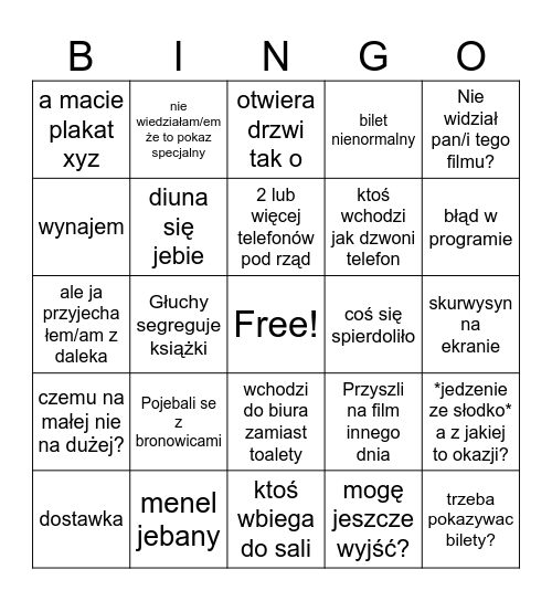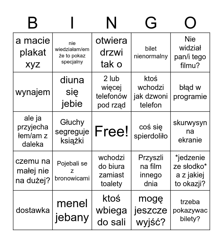 This bingo card has a free space and 24 words: Pojebali se z bronowicami, menel jebany, 2 lub więcej telefonów pod rząd, dostawka, Nie widział pan/i tego filmu?, a macie plakat xyz, wynajem, nie wiedziałam/em że to pokaz specjalny, coś się spierdoliło, wchodzi do biura zamiast toalety, ktoś wchodzi jak dzwoni telefon, ale ja przyjecha łem/am z daleka, Przyszli na film innego dnia, *jedzenie ze słodko* a z jakiej to okazji?, diuna się jebie, mogę jeszcze wyjść?, skurwysyn na ekranie, otwiera drzwi tak o, błąd w programie, Głuchy segreguje książki, trzeba pokazywac bilety?, czemu na małej nie na dużej?, bilet nienormalny and ktoś wbiega do sali.