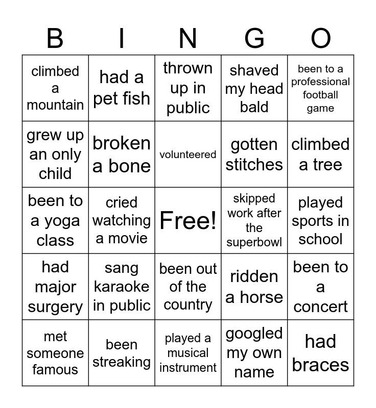 This bingo card has a free space and 24 words: sang karaoke in public, been streaking, volunteered, met someone famous, been to a professional football game, climbed a mountain, grew up an only child, had a pet fish, skipped work after the superbowl, been out of the country, gotten stitches, been to a yoga class, ridden a horse, been to a concert, broken a bone, googled my own name, played sports in school, thrown up in public, climbed a tree, cried watching a movie, had braces, had major surgery, shaved my head bald and played a musical instrument.