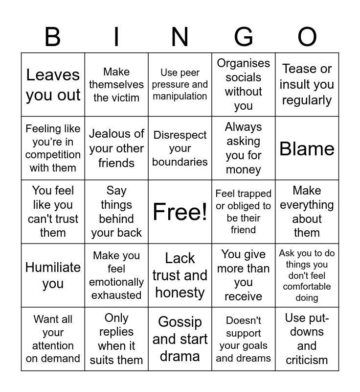 This bingo card has a free space and 24 words: Make you feel emotionally exhausted, Only replies when it suits them, Disrespect your boundaries, Want all your attention on demand, Tease or insult you regularly, Leaves you out, Feeling like you’re in competition with them, Make themselves the victim, Feel trapped or obliged to be their friend, Lack trust and honesty, Always asking you for money, You feel like you can't trust them, You give more than you receive, Ask you to do things you don't feel comfortable doing, Jealous of your other friends, Doesn't support your goals and dreams, Make everything about them, Use peer pressure and manipulation, Blame, Say things behind your back, Use put-downs and criticism, Humiliate you, Organises socials without you and Gossip and start drama.