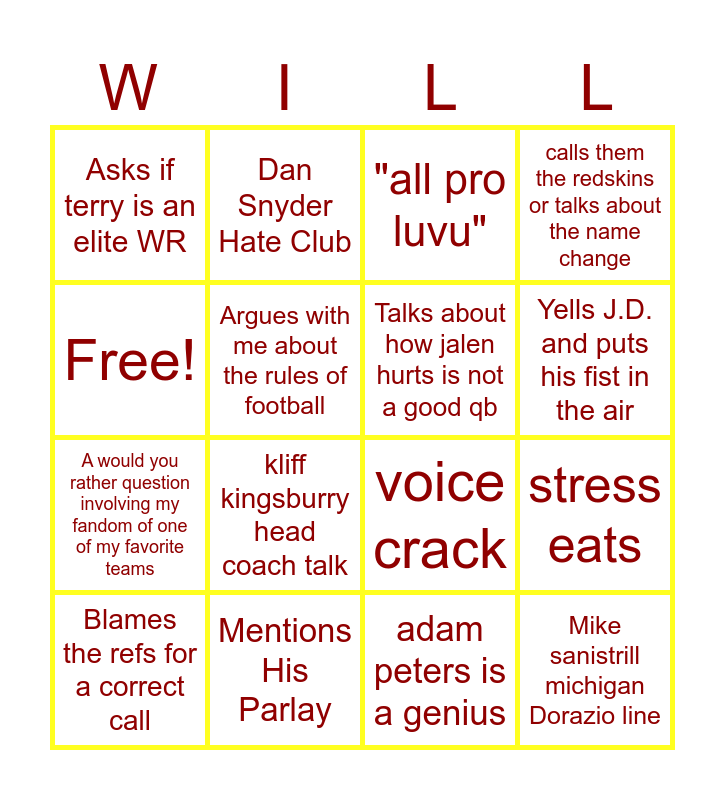 This bingo card has 16 words: Mentions His Parlay, stress eats, "all pro luvu", Asks if terry is an elite WR, A would you rather question involving my fandom of one of my favorite teams, Dan Snyder Hate Club, voice crack, adam peters is a genius, Free!, Argues with me about the rules of football, Blames the refs for a correct call, calls them the redskins or talks about the name change, kliff kingsburry head coach talk, Yells J.D. and puts his fist in the air, Talks about how jalen hurts is not a good qb and Mike sanistrill michigan Dorazio line.