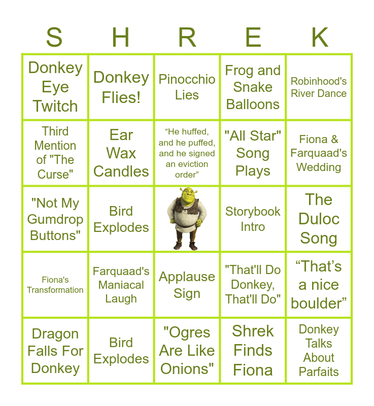 This bingo card has a free space and 29 words: Dragon Falls For Donkey, Farquaad Short Joke, Bird Explodes, Burp Off!, Donkey Eye Twitch, Pinocchio Lies, Ear Wax Candles, Farquaad's Maniacal Laugh, Storybook Intro, Bird Explodes, The Duloc Song, Donkey Talks About Parfaits, "Ogres Are Like Onions", Shrek Finds Fiona, Fiona & Farquaad's Wedding, "Now I'm a Flying, Talking Donkey!", Applause Sign, Fiona's Transformation, Robinhood's River Dance, "Not My Gumdrop Buttons", "That'll Do Donkey, That'll Do", Donkey Sings, "All Star" Song Plays, Third Mention of "The Curse", Frog and Snake Balloons, Donkey Flies!, “That’s a nice boulder”, “He huffed, and he puffed, and he signed an eviction order” and “Some of you may die, but that’s a risk I’m willing to take”.