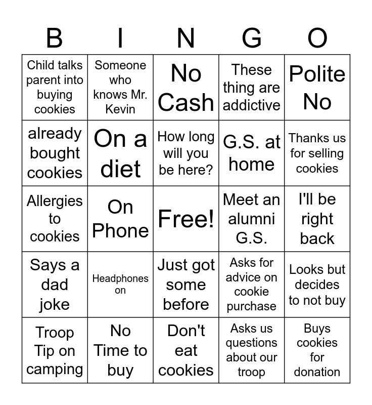 This bingo card has a free space and 29 words: Troop Tip on camping, sell to someone who knows MR kevin, On Phone, Person decides to buy 1 more box, Child talks parent into buying cookies, No Cash, On a diet, Headphones on, Meet an alumni G.S., No Time to buy, I'll be right back, Buys cookies for donation, Don't eat cookies, Asks us questions about our troop, Thanks us for selling cookies, Looking at their phone, Just got some before, Says a dad joke, Polite No, Allergies to cookies, Asks for advice on cookie purchase, Ignore, G.S. at home, already bought cookies, These thing are addictive, Someone who knows Mr. Kevin, Looks but decides to not buy, How long will you be here? and Too expensive.