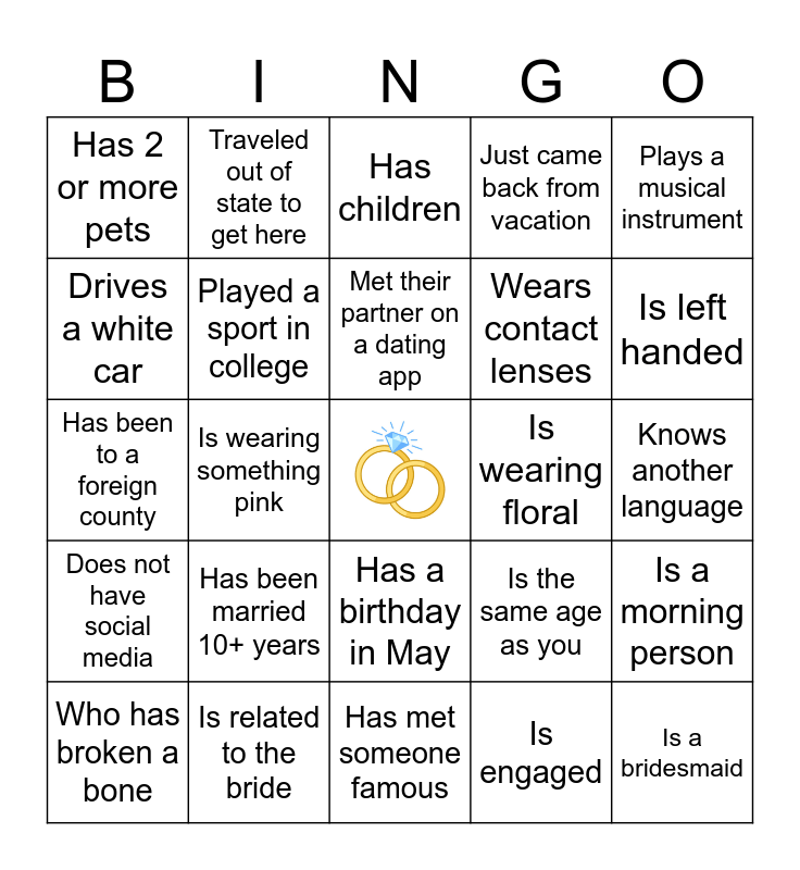 This bingo card has a free space and 30 words: Is related to the bride, Is related to the groom, Is wearing something pink, Traveled one hour or more to get here, Has 2 or more pets, Has children, Played a sport in college, Has a birthday in May, Is wearing floral, Has met someone famous, Knows another language, Is a bridesmaid, Is engaged, Went to school with the bride, Is left handed, Has a masters degree, Is the same age as you, Does not have social media, Has been married 10+ years, Plays a musical instrument, Has been to a foreign county, Has lived out of the country, Traveled out of state to get here, Wears contact lenses, Drives a white car, Just came back from vacation, Is a morning person, Who has broken a bone, Met their partner on a dating app and Is a Pisces.
