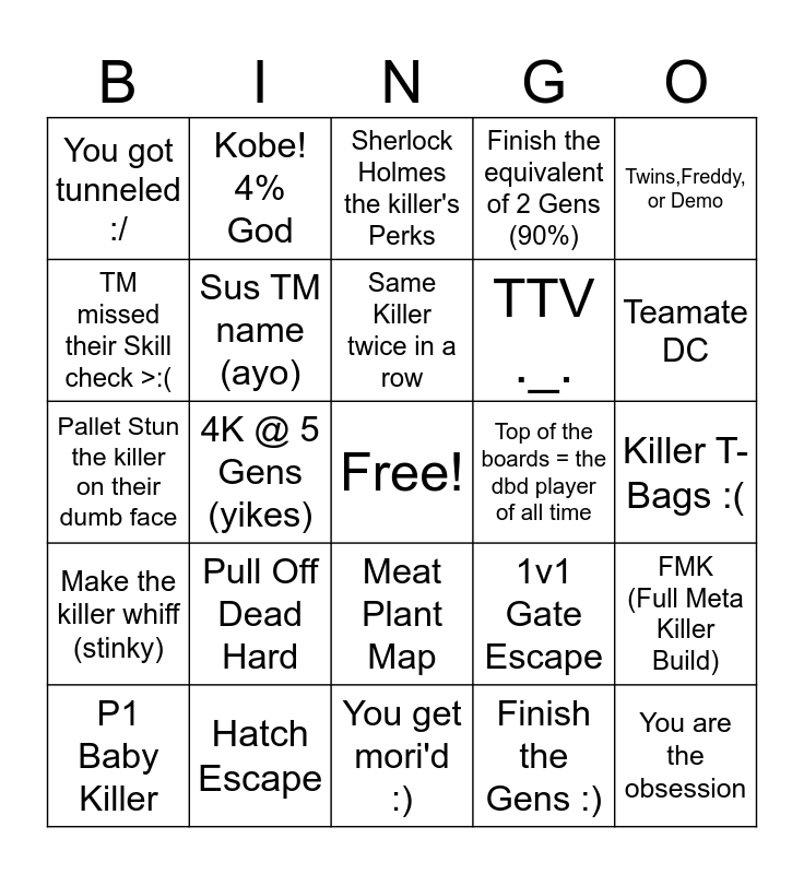This bingo card has a free space and 24 words: Pull Off Dead Hard, Hatch Escape, Same Killer twice in a row, P1 Baby Killer, Twins,Freddy, or Demo, You got tunneled :/, TM missed their Skill check >:(, Kobe! 4% God, Top of the boards = the dbd player of all time, Meat Plant Map, TTV ._., Pallet Stun the killer on their dumb face, 1v1 Gate Escape, FMK (Full Meta Killer Build), Sus TM name (ayo), Finish the Gens :), Killer T-Bags :(, Sherlock Holmes the killer's Perks, Teamate DC, 4K @ 5 Gens (yikes), You are the obsession, Make the killer whiff (stinky), Finish the equivalent of 2 Gens (90%) and You get mori'd :).
