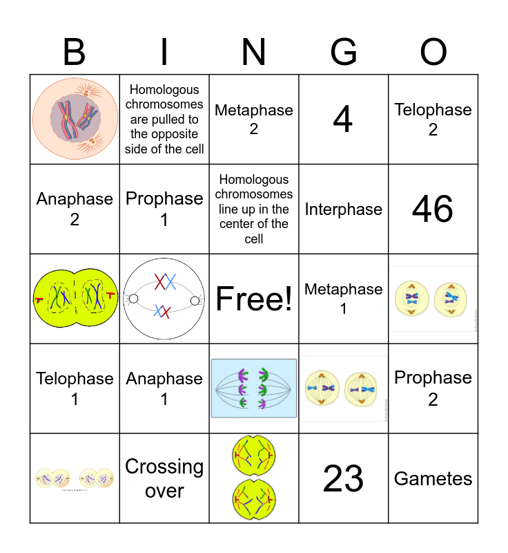 This bingo card has 8 images, a free space and 16 words: Anaphase 1, Crossing over, Homologous chromosomes line up in the center of the cell, Telophase 2, Anaphase 2, Homologous chromosomes are pulled to the opposite side of the cell, Metaphase 1, Interphase, Prophase 2, Prophase 1, 23, Metaphase 2, 46, Gametes, Telophase 1 and 4.