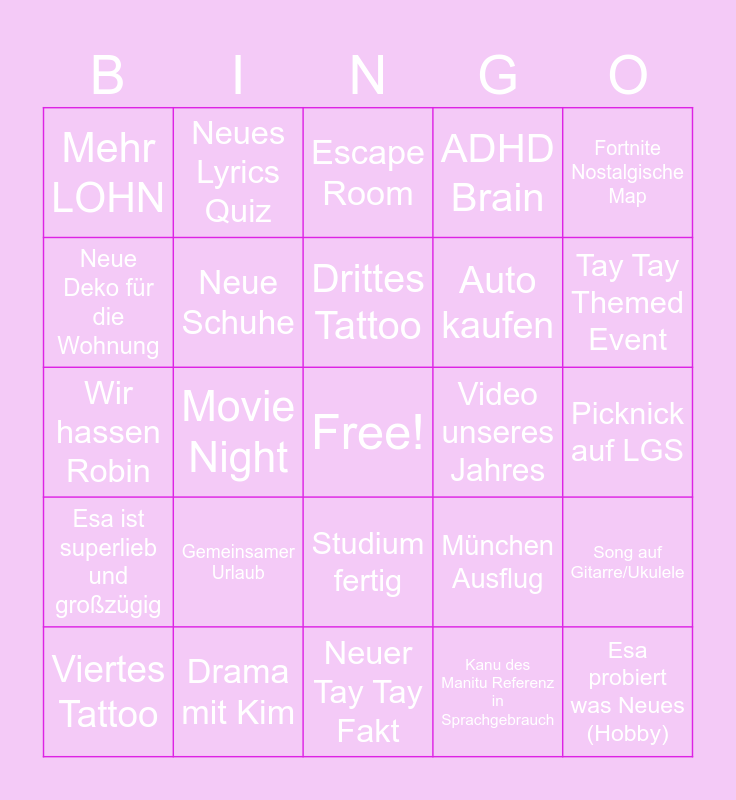 This bingo card has a free space and 24 words: Gemeinsamer Urlaub, Drama mit Kim, Drittes Tattoo, Viertes Tattoo, Fortnite Nostalgische Map, Mehr LOHN, Neue Deko für die Wohnung, Neues Lyrics Quiz, Video unseres Jahres, Studium fertig, Auto kaufen, Wir hassen Robin, München Ausflug, Song auf Gitarre/Ukulele, Neue Schuhe, Kanu des Manitu Referenz in Sprachgebrauch, Picknick auf LGS, Escape Room, Tay Tay Themed Event, Movie Night, Esa probiert was Neues (Hobby), Esa ist superlieb und großzügig, ADHD Brain and Neuer Tay Tay Fakt.