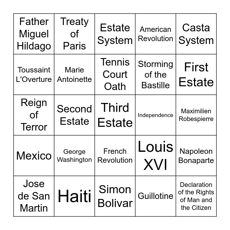 This bingo card has 25 words: George Washington, Simon Bolivar, Tennis Court Oath, Jose de San Martin, Casta System, Father Miguel Hildago, Toussaint L'Overture, Treaty of Paris, Independence, French Revolution, Storming of the Bastille, Reign of Terror, Louis XVI, Napoleon Bonaparte, Marie Antoinette, Declaration of the Rights of Man and the Citizen, Maximilien Robespierre, Estate System, First Estate, Second Estate, Third Estate, Haiti, Mexico, American Revolution and Guillotine.