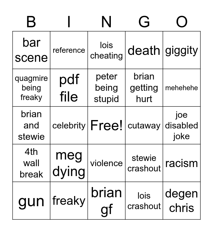 This bingo card has a free space and 24 words: meg dying, freaky, peter being stupid, gun, giggity, bar scene, quagmire being freaky, reference, cutaway, violence, brian getting hurt, brian and stewie, stewie crashout, racism, pdf file, lois crashout, joe disabled joke, lois cheating, mehehehe, celebrity, degen chris, 4th wall break, death and brian gf.