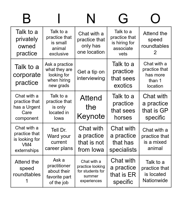This bingo card has a free space and 24 words: Tell Dr. Ward your current career plans, Ask a practitioner about their favorite part of the job, Get a tip on interviewing, Attend the speed roundtables 1, Attend the speed roundtables 2, Talk to a privately owned practice, Talk to a corporate practice, Talk to a practice that is small animal exclusive, Talk to a practice that sees horses, Chat with a practice that is not from Iowa, Talk to a practice that sees exotics, Chat with a practice that has a Urgent Care component, Chat with a practice that has specialists, Chat with a practice that is a mixed animal, Ask a practice what they are looking for when hiring new grads, Chat with a practice that is ER specific, Chat with a practice that is GP specific, Chat with a practice that only has one location, Chat with a practice that has more than 1 location, Talk to a practice that is only located in Iowa, Talk to a practice that is located Nationwide, Chat with a practice that is looking for VM4 externships, Talk to a practice that is hiring for associate vets and Chat with a practice looking for students for summer experiences.