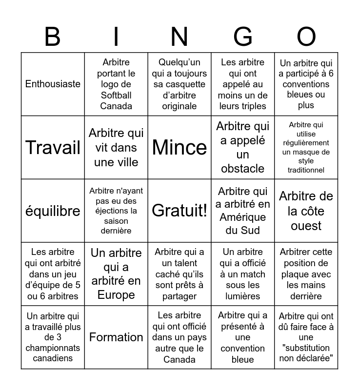This bingo card has a free space and 24 words: Un arbitre qui a arbitré en Europe, Formation, Mince, Un arbitre qui a travaillé plus de 3 championnats canadiens, Un arbitre qui a participé à 6 conventions bleues ou plus, Enthousiaste, Travail, Arbitre portant le logo de Softball Canada, Arbitre qui a arbitré en Amérique du Sud, Arbitre qui a un talent caché qu’ils sont prêts à partager, Arbitre qui a appelé un obstacle, équilibre, Un arbitre qui a officié à un match sous les lumières, Arbitrer cette position de plaque avec les mains derrière, Arbitre qui vit dans une ville, Arbitre qui a présenté à une convention bleue, Arbitre de la côte ouest, Quelqu’un qui a toujours sa casquette d’arbitre originale, Arbitre qui utilise régulièrement un masque de style traditionnel, Arbitre n'ayant pas eu des éjections la saison dernière, Arbitre qui ont dû faire face à une "substitution non déclarée", Les arbitre qui ont arbitré dans un jeu d’équipe de 5 ou 6 arbitres, Les arbitre qui ont appelé au moins un de leurs triples and Les arbitre qui ont officié dans un pays autre que le Canada.