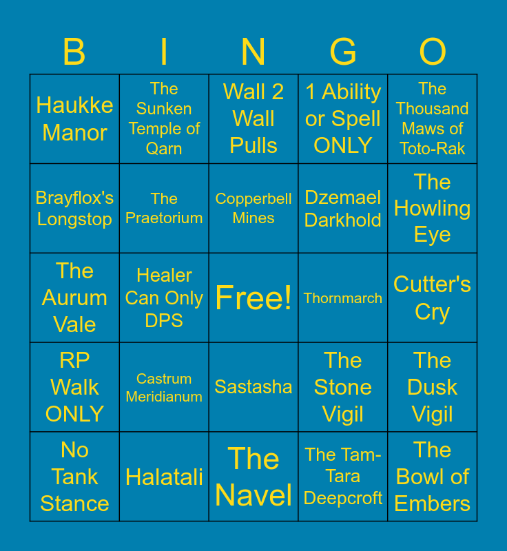 This bingo card has a free space and 26 words: Sastasha, The Tam-Tara Deepcroft, Copperbell Mines, Halatali, The Thousand Maws of Toto-Rak, Haukke Manor, Brayflox's Longstop, The Sunken Temple of Qarn, Cutter's Cry, The Stone Vigil, Dzemael Darkhold, The Aurum Vale, The Dusk Vigil, No Tank Stance, Healer Can Only DPS, FLOOR IS LAVA! You cant stop moving, 1 Ability or Spell ONLY, RP Walk ONLY, Wall 2 Wall Pulls, The Bowl of Embers, The Howling Eye, The Navel, Thornmarch, Castrum Meridianum, The Praetorium and The Porta Decumana.