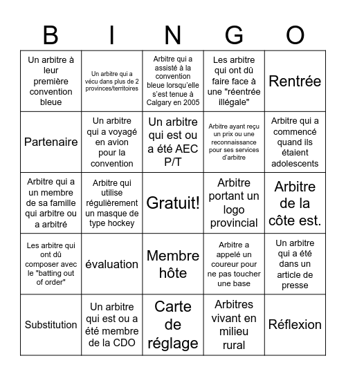 This bingo card has a free space and 24 words: évaluation, Un arbitre qui est ou a été membre de la CDO, Un arbitre qui est ou a été AEC P/T, Substitution, Rentrée, Un arbitre à leur première convention bleue, Partenaire, Un arbitre qui a vécu dans plus de 2 provinces/territoires, Arbitre portant un logo provincial, Membre hôte, Arbitre ayant reçu un prix ou une reconnaissance pour ses services d’arbitre, Arbitre qui a un membre de sa famille qui arbitre ou a arbitré, Arbitre a appelé un coureur pour ne pas toucher une base, Un arbitre qui a été dans un article de presse, Un arbitre qui a voyagé en avion pour la convention, Arbitres vivant en milieu rural, Arbitre de la côte est., Arbitre qui a assisté à la convention bleue lorsqu’elle s’est tenue à Calgary en 2005, Arbitre qui a commencé quand ils étaient adolescents, Arbitre qui utilise régulièrement un masque de type hockey, Réflexion, Les arbitre qui ont dû composer avec le "batting out of order", Les arbitre qui ont dû faire face à une "réentrée illégale" and Carte de réglage.