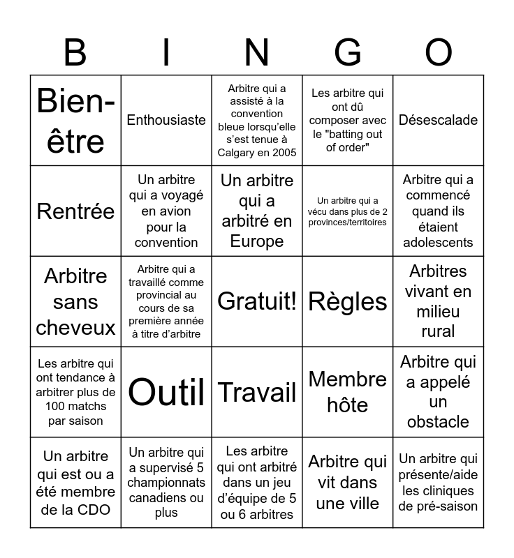This bingo card has a free space and 24 words: Outil, Un arbitre qui a supervisé 5 championnats canadiens ou plus, Un arbitre qui a arbitré en Europe, Un arbitre qui est ou a été membre de la CDO, Désescalade, Bien-être, Rentrée, Enthousiaste, Règles, Travail, Un arbitre qui a vécu dans plus de 2 provinces/territoires, Arbitre sans cheveux, Membre hôte, Arbitre qui a appelé un obstacle, Un arbitre qui a voyagé en avion pour la convention, Arbitre qui vit dans une ville, Arbitres vivant en milieu rural, Arbitre qui a assisté à la convention bleue lorsqu’elle s’est tenue à Calgary en 2005, Arbitre qui a commencé quand ils étaient adolescents, Arbitre qui a travaillé comme provincial au cours de sa première année à titre d’arbitre, Un arbitre qui présente/aide les cliniques de pré-saison, Les arbitre qui ont tendance à arbitrer plus de 100 matchs par saison, Les arbitre qui ont dû composer avec le "batting out of order" and Les arbitre qui ont arbitré dans un jeu d’équipe de 5 ou 6 arbitres.