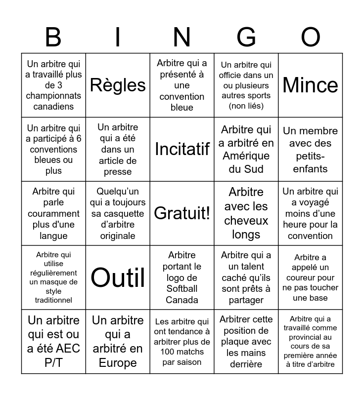 This bingo card has a free space and 24 words: Outil, Un arbitre qui a arbitré en Europe, Incitatif, Un arbitre qui est ou a été AEC P/T, Mince, Un arbitre qui a travaillé plus de 3 championnats canadiens, Un arbitre qui a participé à 6 conventions bleues ou plus, Règles, Arbitre avec les cheveux longs, Arbitre portant le logo de Softball Canada, Arbitre qui a arbitré en Amérique du Sud, Arbitre qui parle couramment plus d'une langue, Arbitre qui a un talent caché qu’ils sont prêts à partager, Arbitre a appelé un coureur pour ne pas toucher une base, Un arbitre qui a été dans un article de presse, Arbitrer cette position de plaque avec les mains derrière, Un arbitre qui a voyagé moins d’une heure pour la convention, Arbitre qui a présenté à une convention bleue, Un membre avec des petits-enfants, Quelqu’un qui a toujours sa casquette d’arbitre originale, Arbitre qui a travaillé comme provincial au cours de sa première année à titre d’arbitre, Arbitre qui utilise régulièrement un masque de style traditionnel, Un arbitre qui officie dans un ou plusieurs autres sports (non liés) and Les arbitre qui ont tendance à arbitrer plus de 100 matchs par saison.