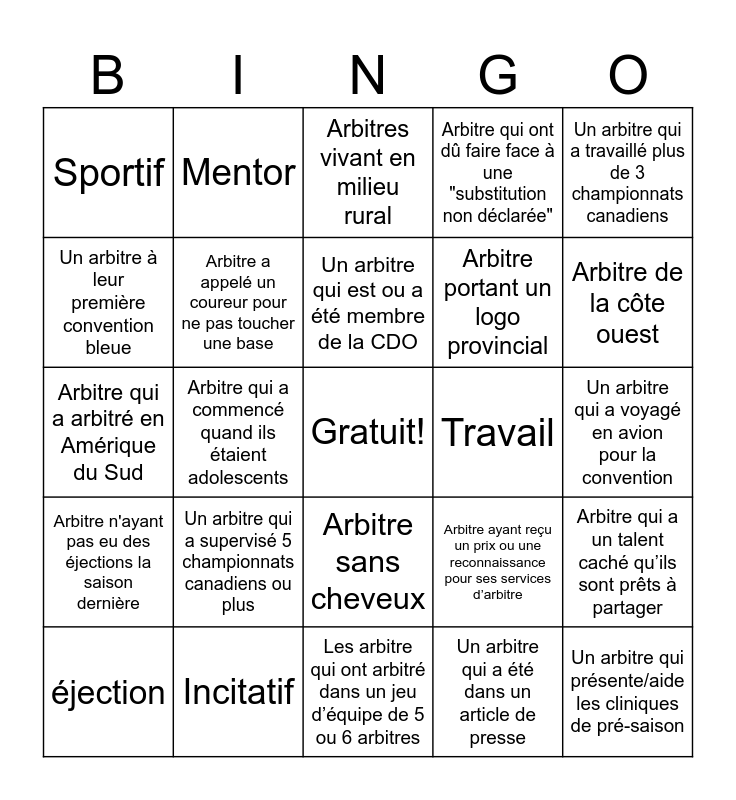 This bingo card has a free space and 24 words: Un arbitre qui a supervisé 5 championnats canadiens ou plus, Incitatif, Un arbitre qui est ou a été membre de la CDO, éjection, Un arbitre qui a travaillé plus de 3 championnats canadiens, Sportif, Un arbitre à leur première convention bleue, Mentor, Travail, Arbitre sans cheveux, Arbitre portant un logo provincial, Arbitre qui a arbitré en Amérique du Sud, Arbitre ayant reçu un prix ou une reconnaissance pour ses services d’arbitre, Arbitre qui a un talent caché qu’ils sont prêts à partager, Arbitre a appelé un coureur pour ne pas toucher une base, Un arbitre qui a été dans un article de presse, Un arbitre qui a voyagé en avion pour la convention, Arbitres vivant en milieu rural, Arbitre de la côte ouest, Arbitre qui a commencé quand ils étaient adolescents, Un arbitre qui présente/aide les cliniques de pré-saison, Arbitre n'ayant pas eu des éjections la saison dernière, Arbitre qui ont dû faire face à une "substitution non déclarée" and Les arbitre qui ont arbitré dans un jeu d’équipe de 5 ou 6 arbitres.