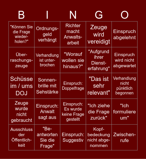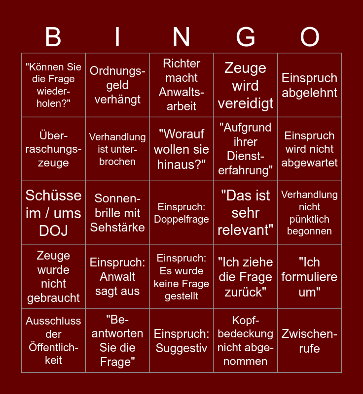 This bingo card has 50 words: Einspruch: Relevanz, Einspruch: Doppelfrage, Einspruch: Frage bereits beantwortet, Einspruch: Suggestiv, Einspruch: Anwalt sagt aus, Einspruch: Spekulation, Ordnungs-geld verhängt, Ordnungs-geld gefordert, Über-raschungs- zeuge, COCP, Verhandlung ist unter-brochen, Zeuge wird vereidigt, "Ich formuliere um", "Ich ziehe die Frage zurück", Diskussion unter Richtern, Vortreten an Richterpult, "Worauf wollen sie hinaus?", "Das ist sehr relevant", Einspruch statt-gegeben, Einspruch abgelehnt, Sonnen-brille mit Sehstärke, Kopf-bedeckung nicht abge-nommen, "Können Sie die Frage wieder-holen?", "Aufgrund ihrer Dienst-erfahrung", "Seien Sie konkreter", Zwischen-rufe, Einspruch wird nicht abgewartet, "Eine Frage habe ich noch", Richter macht Anwalts-arbeit, Einspruch: Es wurde keine Frage gestellt, "Es war neblig", Angeklagter nicht anwesend, Anwalt nicht anwesend, Name falsch gesagt, "Be-antworten Sie die Frage", "Ich verstehe die Frage nicht", Belei-digung, "Das ist nicht suggestiv", Zu langes Plädoyer, Verhandlung nicht pünktlich begonnen, "Ich habe nicht zugehört", Plädoyer unter-brochen, Zeuge schweift ab, Kein Richter verfügbar, Ausschluss der Öffentlich-keit, Schüsse im / ums DOJ, Jemand wurde Saal verwiesen, Verhandlung über 3 Stunden, Zeuge wurde nicht gebraucht and Gespieltes Lachen.