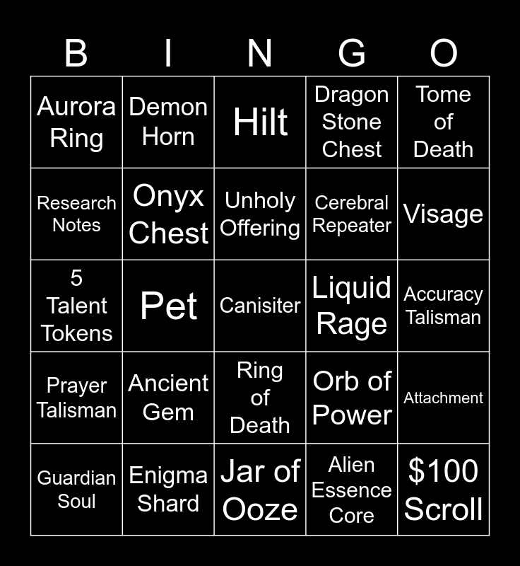 This bingo card has a free space and 24 words: Ancient Gem, Enigma Shard, Unholy Offering, Guardian Soul, Tome of Death, Aurora Ring, Research Notes, Demon Horn, Liquid Rage, Ring of Death, Cerebral Repeater, 5 Talent Tokens, Orb of Power, Attachment, Onyx Chest, Alien Essence Core, Accuracy Talisman, Hilt, Visage, Pet, $100 Scroll, Prayer Talisman, Dragon Stone Chest and Jar of Ooze.