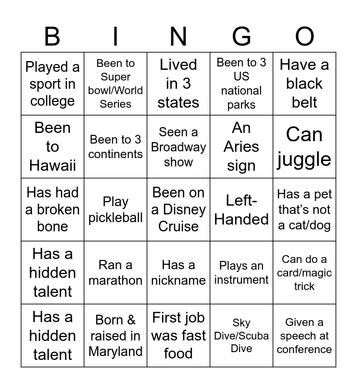 This bingo card has 30 words: Born & raised in Maryland, Served in the Military, Play pickleball, Has more than 2 siblings, Played a sport in college, Lived in 3 states, Been to 3 continents, Has a nickname, Left-Handed, First job was fast food, Has a pet that’s not a cat/dog, Been on a Disney Cruise, Sky Dive/Scuba Dive, Given a speech at conference, Can juggle, Speaks more than 1 language, Plays an instrument, Has a hidden talent, Ran a marathon, Have a black belt, Has had a broken bone, Binge watched TV series this month, Been to Super bowl/World Series, An Aries sign, Been to Hawaii, Been to 3 US national parks, Can do a card/magic trick, Has a hidden talent, Seen a Broadway show and Been to more than 10 states.