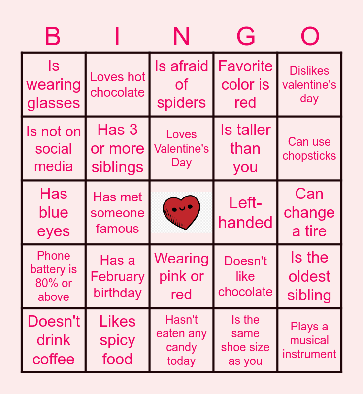 This bingo card has a free space and 24 words: Has a February birthday, Likes spicy food, Loves Valentine's Day, Doesn't drink coffee, Dislikes valentine's day, Is wearing glasses, Is not on social media, Loves hot chocolate, Left-handed, Wearing pink or red, Is taller than you, Has blue eyes, Doesn't like chocolate, Is the oldest sibling, Has 3 or more siblings, Is the same shoe size as you, Can change a tire, Is afraid of spiders, Can use chopsticks, Has met someone famous, Plays a musical instrument, Phone battery is 80% or above, Favorite color is red and Hasn't eaten any candy today.