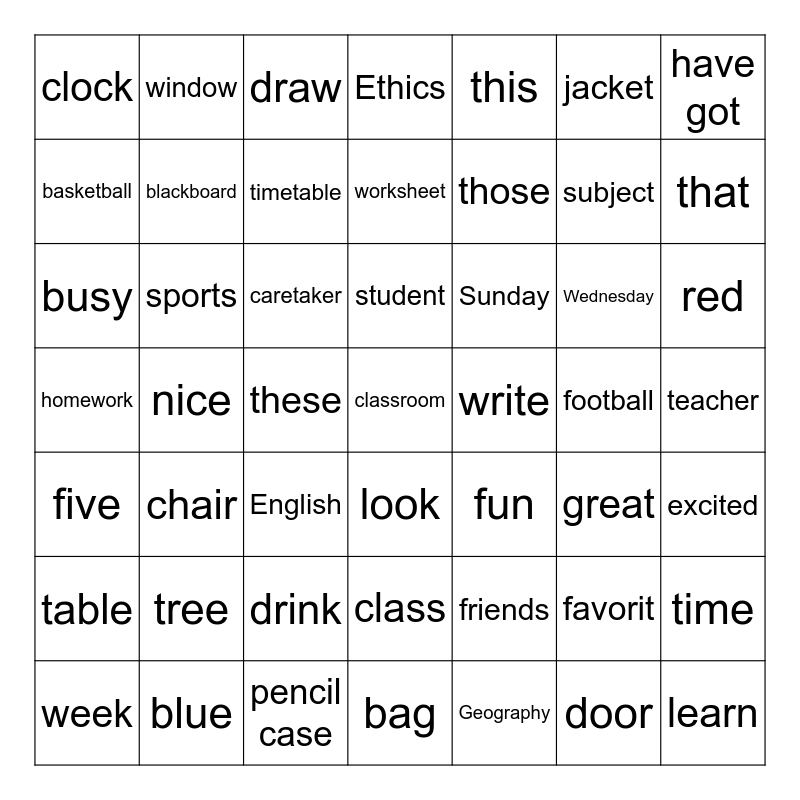 This bingo card has 49 words: favorit, subject, Geography, nice, caretaker, teacher, window, pencil case, jacket, look, have got, Ethics, Wednesday, Sunday, tree, football, basketball, that, time, this, those, these, clock, blackboard, week, timetable, red, blue, student, sports, learn, write, table, drink, homework, fun, great, excited, busy, English, class, five, classroom, bag, worksheet, draw, friends, chair and door.