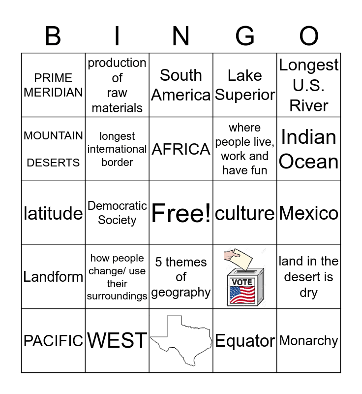 This bingo card has 2 images, a free space and 22 words: how people change/ use their surroundings, WEST, AFRICA, PACIFIC, Longest U.S. River, PRIME MERIDIAN, MOUNTAIN DESERTS, production of raw materials, culture, 5 themes of geography, where people live, work and have fun, latitude, land in the desert is dry, longest international border, Equator, Mexico, South America, Indian Ocean, Democratic Society, Monarchy, Landform and Lake Superior.