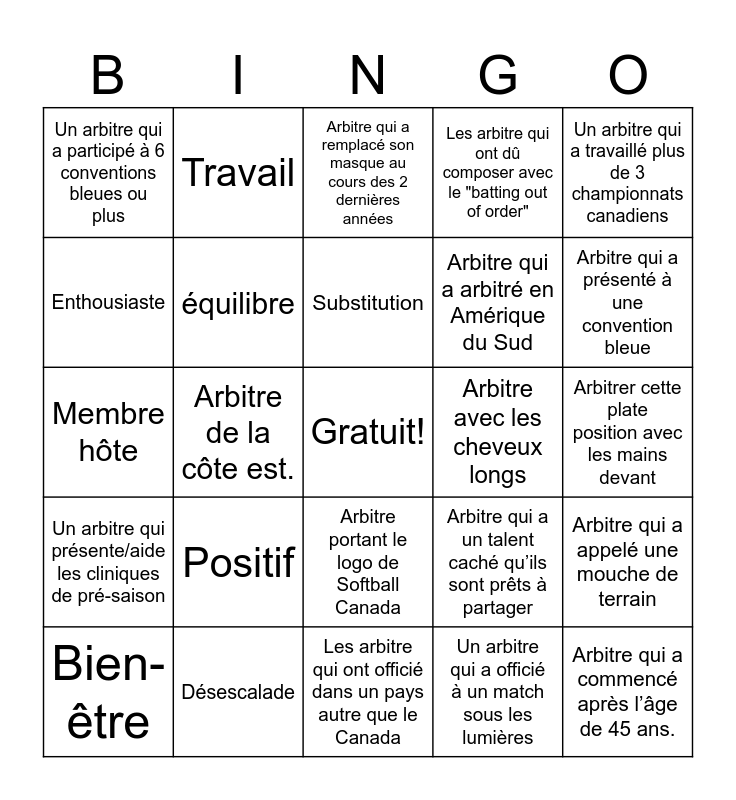 This bingo card has a free space and 24 words: Positif, Désescalade, Substitution, Bien-être, Un arbitre qui a travaillé plus de 3 championnats canadiens, Un arbitre qui a participé à 6 conventions bleues ou plus, Enthousiaste, Travail, Arbitre avec les cheveux longs, Arbitre portant le logo de Softball Canada, Arbitre qui a arbitré en Amérique du Sud, Membre hôte, Arbitre qui a un talent caché qu’ils sont prêts à partager, Arbitre qui a appelé une mouche de terrain, équilibre, Un arbitre qui a officié à un match sous les lumières, Arbitrer cette plate position avec les mains devant, Arbitre qui a remplacé son masque au cours des 2 dernières années, Arbitre qui a présenté à une convention bleue, Arbitre de la côte est., Arbitre qui a commencé après l’âge de 45 ans., Un arbitre qui présente/aide les cliniques de pré-saison, Les arbitre qui ont dû composer avec le "batting out of order" and Les arbitre qui ont officié dans un pays autre que le Canada.