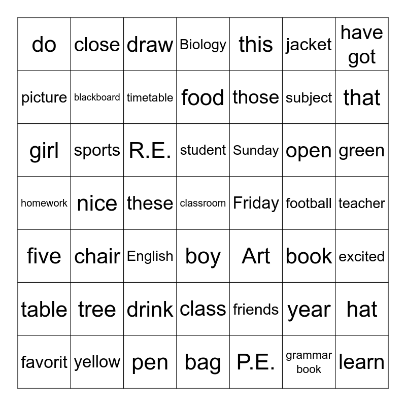 This bingo card has 49 words: year, subject, P.E., nice, R.E., teacher, close, pen, jacket, boy, have got, Biology, open, Sunday, tree, football, picture, that, hat, this, those, these, do, blackboard, favorit, timetable, green, yellow, student, sports, learn, Friday, table, drink, homework, Art, book, excited, girl, English, class, five, classroom, bag, food, draw, friends, chair and grammar book.