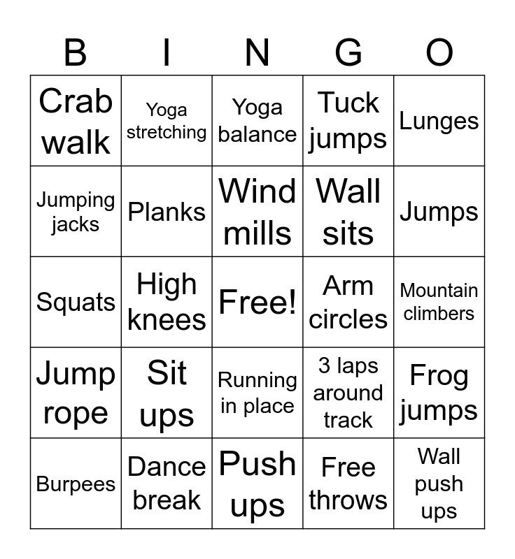 This bingo card has a free space and 24 words: Sit ups, Dance break, Wind mills, Burpees, Lunges, Crab walk, Jumping jacks, Yoga stretching, Arm circles, Running in place, Wall sits, Squats, 3 laps around track, Frog jumps, Planks, Free throws, Mountain climbers, Yoga balance, Jumps, High knees, Wall push ups, Jump rope, Tuck jumps and Push ups.