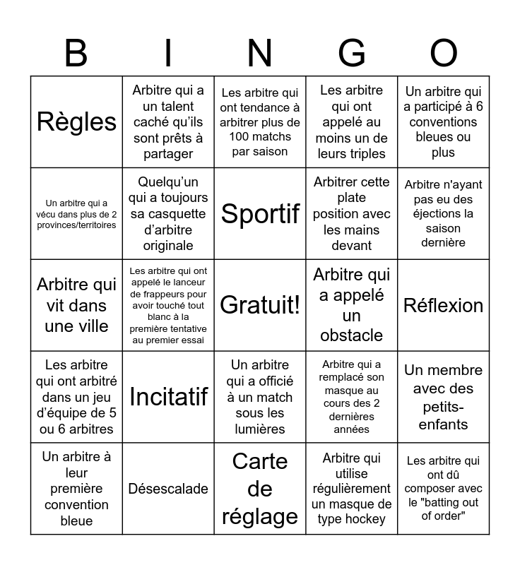 This bingo card has a free space and 24 words: Incitatif, Désescalade, Sportif, Un arbitre à leur première convention bleue, Un arbitre qui a participé à 6 conventions bleues ou plus, Règles, Un arbitre qui a vécu dans plus de 2 provinces/territoires, Arbitre qui a un talent caché qu’ils sont prêts à partager, Arbitre qui a appelé un obstacle, Un arbitre qui a officié à un match sous les lumières, Arbitrer cette plate position avec les mains devant, Arbitre qui vit dans une ville, Arbitre qui a remplacé son masque au cours des 2 dernières années, Un membre avec des petits-enfants, Quelqu’un qui a toujours sa casquette d’arbitre originale, Arbitre qui utilise régulièrement un masque de type hockey, Réflexion, Les arbitre qui ont tendance à arbitrer plus de 100 matchs par saison, Arbitre n'ayant pas eu des éjections la saison dernière, Les arbitre qui ont appelé le lanceur de frappeurs pour avoir touché tout blanc à la première tentative au premier essai, Les arbitre qui ont dû composer avec le "batting out of order", Les arbitre qui ont arbitré dans un jeu d’équipe de 5 ou 6 arbitres, Les arbitre qui ont appelé au moins un de leurs triples and Carte de réglage.