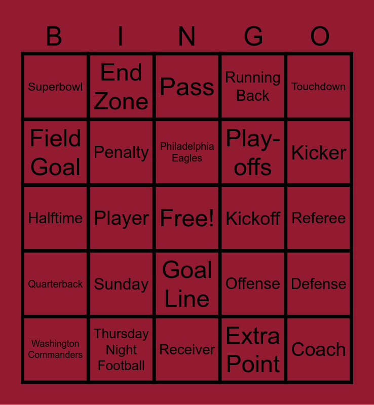 This bingo card has a free space and 24 words: Sunday, Thursday Night Football, Philadelphia Eagles, Washington Commanders, Touchdown, Superbowl, Field Goal, End Zone, Kickoff, Goal Line, Play-offs, Halftime, Offense, Defense, Penalty, Extra Point, Referee, Pass, Kicker, Player, Coach, Quarterback, Running Back and Receiver.