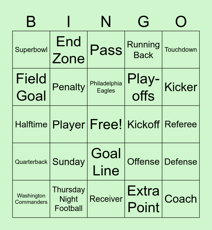 This bingo card has a free space and 24 words: Sunday, Thursday Night Football, Philadelphia Eagles, Washington Commanders, Touchdown, Superbowl, Field Goal, End Zone, Kickoff, Goal Line, Play-offs, Halftime, Offense, Defense, Penalty, Extra Point, Referee, Pass, Kicker, Player, Coach, Quarterback, Running Back and Receiver.