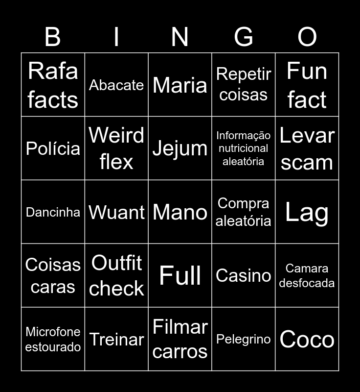 This bingo card has 25 words: Outfit check, Filmar carros, Jejum, Microfone estourado, Fun fact, Rafa facts, Polícia, Abacate, Compra aleatória, Full, Informação nutricional aleatória, Dancinha, Casino, Camara desfocada, Weird flex, Coco, Lag, Maria, Levar scam, Wuant, Mano, Treinar, Coisas caras, Repetir coisas and Pelegrino.