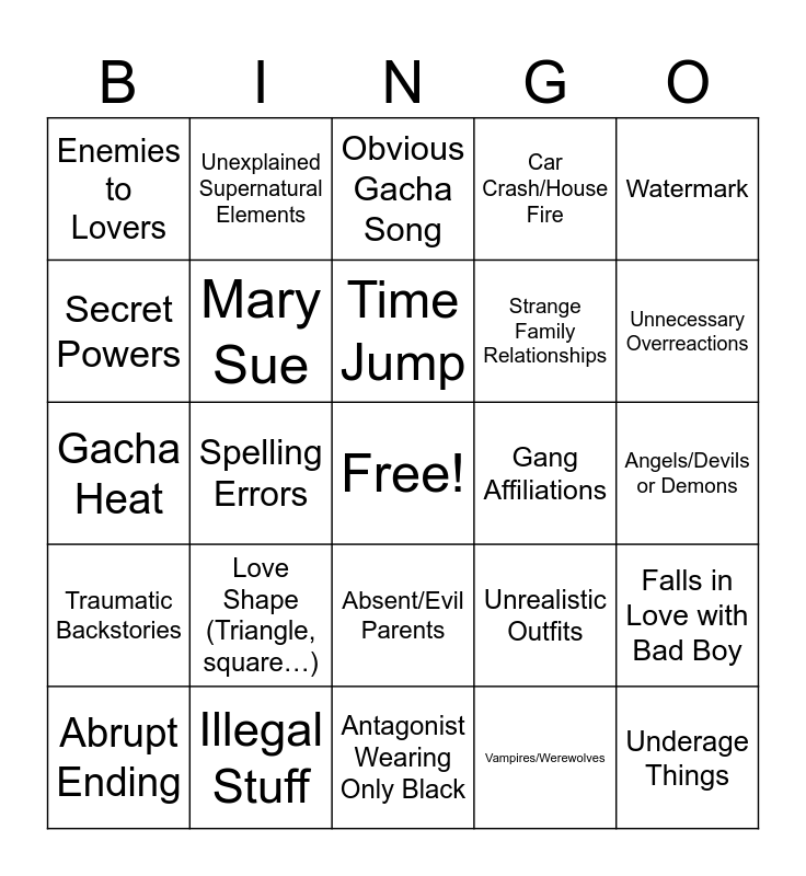 This bingo card has a free space and 24 words: Love Shape (Triangle, square…), Illegal Stuff, Time Jump, Abrupt Ending, Watermark, Enemies to Lovers, Secret Powers, Unexplained Supernatural Elements, Gang Affiliations, Absent/Evil Parents, Strange Family Relationships, Gacha Heat, Unrealistic Outfits, Falls in Love with Bad Boy, Mary Sue, Vampires/Werewolves, Angels/Devils or Demons, Obvious Gacha Song, Unnecessary Overreactions, Spelling Errors, Underage Things, Traumatic Backstories, Car Crash/House Fire and Antagonist Wearing Only Black.
