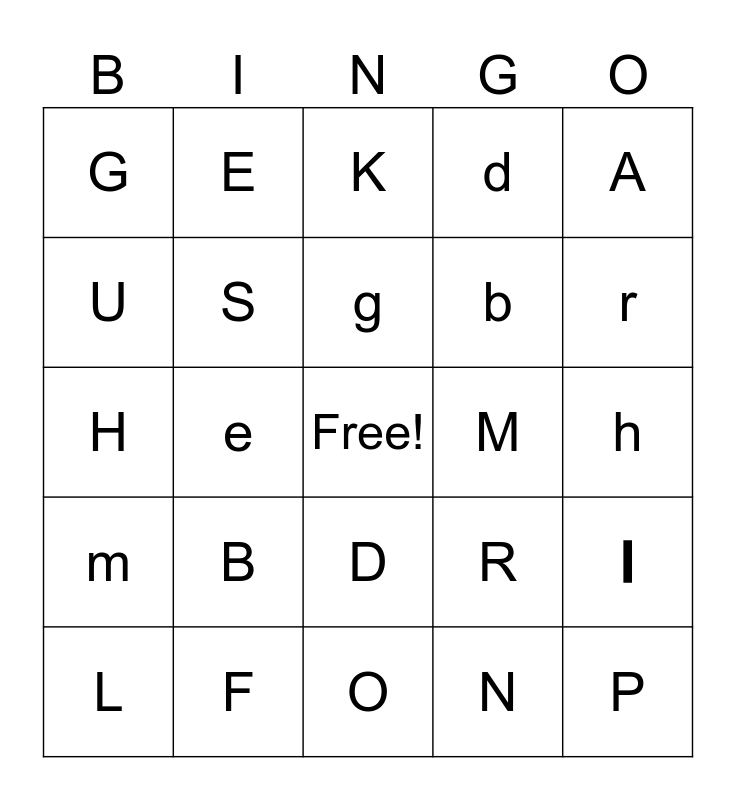 This bingo card has a free space and 24 words: B, F, g, L, A, G, U, E, M, D, b, H, R, I, S, N, h, K, r, e, P, m, d and O.