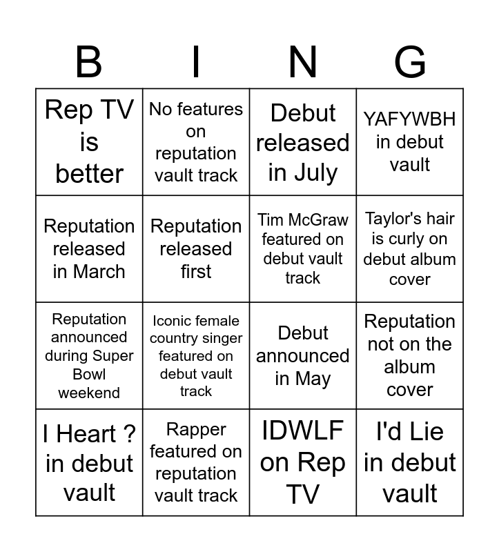 This bingo card has 16 words: Rapper featured on reputation vault track, Reputation not on the album cover, Debut released in July, Rep TV is better, Reputation announced during Super Bowl weekend, No features on reputation vault track, Debut announced in May, IDWLF on Rep TV, Reputation released in March, Reputation released first, I Heart ? in debut vault, YAFYWBH in debut vault, Iconic female country singer featured on debut vault track, Taylor's hair is curly on debut album cover, Tim McGraw featured on debut vault track and I'd Lie in debut vault.