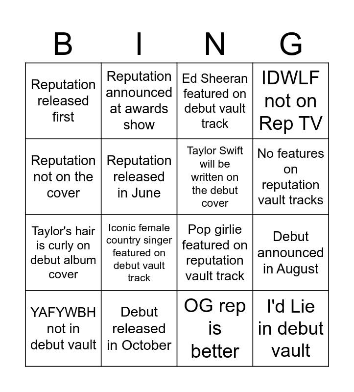 This bingo card has 16 words: Debut released in October, Debut announced in August, Ed Sheeran featured on debut vault track, Reputation released first, Taylor's hair is curly on debut album cover, Reputation announced at awards show, Pop girlie featured on reputation vault track, OG rep is better, Reputation not on the cover, Reputation released in June, YAFYWBH not in debut vault, IDWLF not on Rep TV, Iconic female country singer featured on debut vault track, No features on reputation vault tracks, Taylor Swift will be written on the debut cover and I'd Lie in debut vault.