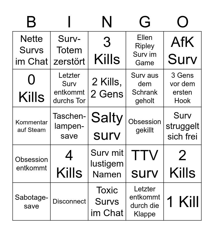 This bingo card has a free space and 24 words: Sabotage- save, 4 Kills, 2 Kills, 2 Gens, Letzter entkommt durch die Klappe, AfK Surv, Nette Survs im Chat, Surv-Totem zerstört, 3 Kills, Obsession gekillt, Surv struggelt sich frei, Kommentar auf Steam, Letzter Surv entkommt durchs Tor, TTV surv, 2 Kills, 0 Kills, Disconnect, Toxic Survs im Chat, Ellen Ripley Surv im Game, 3 Gens vor dem ersten Hook, Obsession entkommt, Taschen- lampen- save, Surv mit lustigem Namen, Surv aus dem Schrank geholt and 1 Kill.