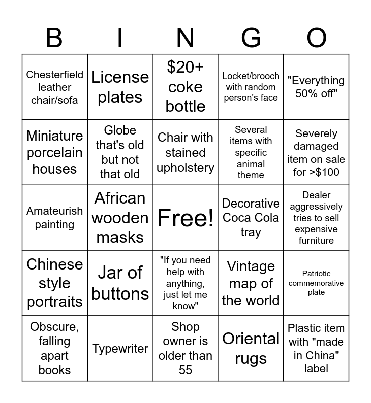 This bingo card has a free space and 39 words: Carnival glass, Colonial porcelain figures, Landscape painting with ornate frame, Globe that's old but not that old, Obscure, falling apart books, "If you need help with anything, just let me know", Chair with stained upholstery, Buddha statues, "Everything 50% off", Chinese style portraits, African wooden masks, Locket/brooch with random person's face, Plastic item with "made in China" label, Dealer aggressively tries to sell expensive furniture, Decorative Coca Cola tray, Jar of buttons, Print depicting obscure historical event with non-English caption, Chesterfield leather chair/sofa, Uranium glass, Vintage map of the world, Miniature porcelain houses, Shop owner is older than 55, Several items with specific animal theme, Severely damaged item on sale for >$100, Racist doll, Portrait of random person, Box of random photographs, Bird cage, Branded wall thermometer, License plates, Circus themed item, Sword or dagger, $20+ coke bottle, Typewriter, Oriental rugs, Local merchandise, Patriotic commemorative plate, Amateurish painting and Too many records.