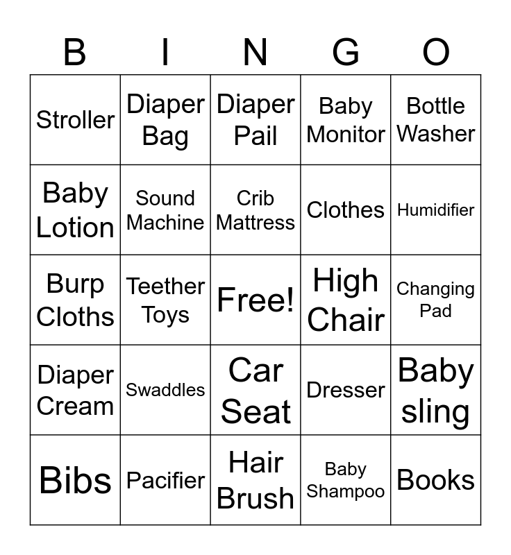 This bingo card has a free space and 28 words: Baby sling, Pack ‘n Play, Clothes, Baby Shampoo, Baby Lotion, Diaper Pail, Diaper Bag, Diaper Cream, High Chair, Bibs, Burp Cloths, Baby Monitor, Pacifier, Hair Brush, Humidifier, Owlet, Swaddles, Sound Machine, Crib Mattress, Car Seat, Stroller, Backseat Camera, Books, Teether Toys, Changing Pad, Dresser, Bottle Washer and Crib Mobile.