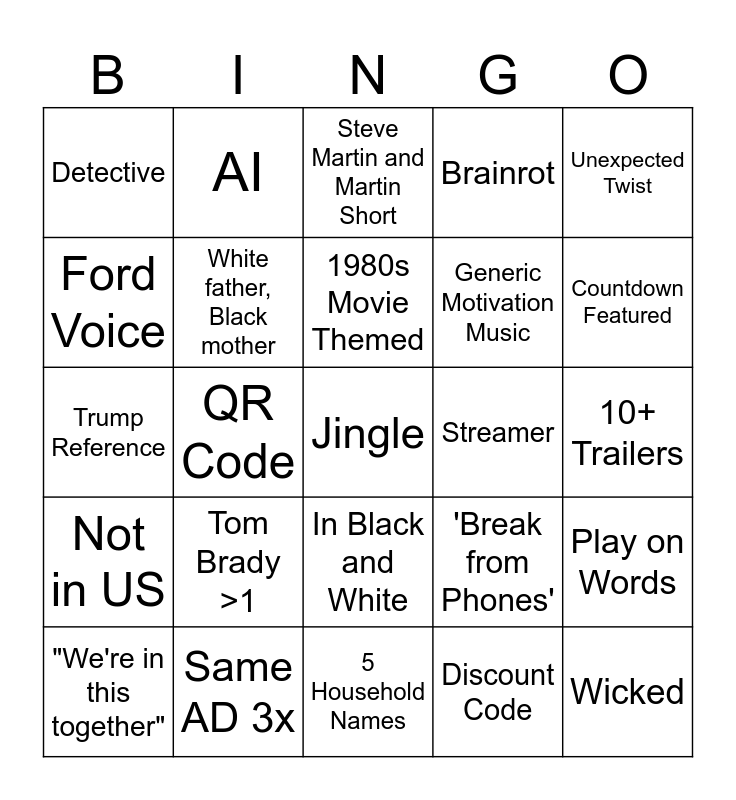 This bingo card has 25 words: Tom Brady >1, 5 Household Names, 1980s Movie Themed, "We're in this together", Unexpected Twist, Detective, Ford Voice, AI, Streamer, In Black and White, Generic Motivation Music, Trump Reference, 'Break from Phones', Play on Words, White father, Black mother, Wicked, 10+ Trailers, Steve Martin and Martin Short, Countdown Featured, QR Code, Jingle, Same AD 3x, Not in US, Brainrot and Discount Code.