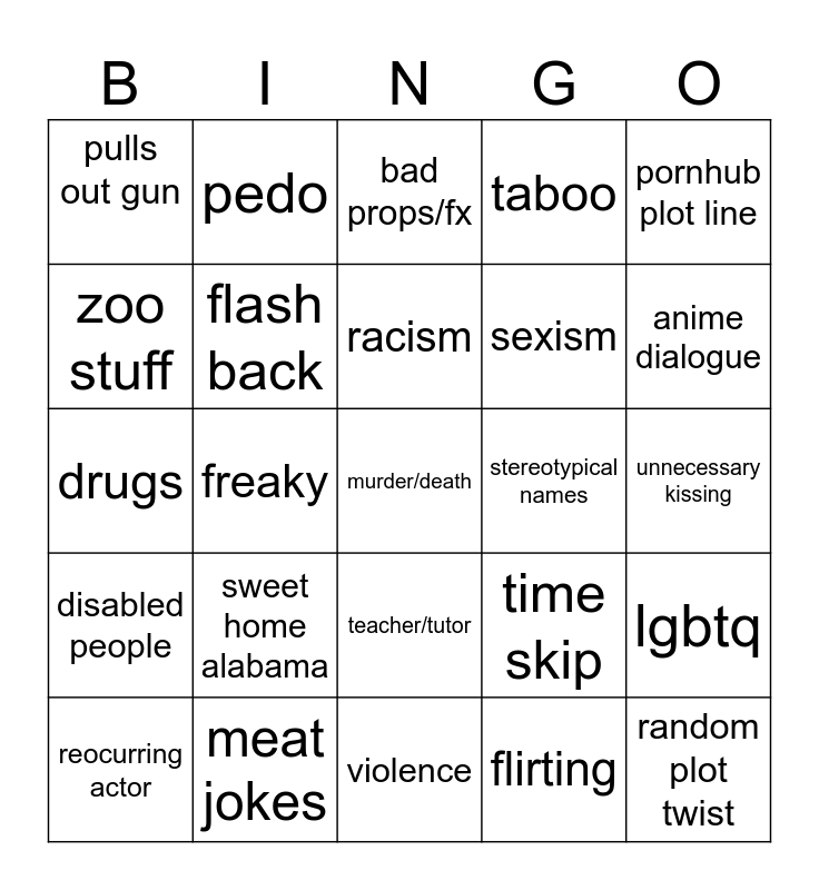 This bingo card has 36 words: crash out, trending topic, super natural, flash back, time skip, disabled people, racism, disrespected all episode, pornhub plot line, cringe, freaky, taboo, weird title Free!, stereotypical names, anime dialogue, pulls out gun, random plot twist, sweet home alabama, murder/death, bad props/fx, unnecessary kissing, lgbtq, meat jokes, reocurring actor, violence, pedo, drugs, voice over, sexism, zoo stuff, kkk, weird moaning, flirting, teacher/tutor, cartoon villian and revenge.