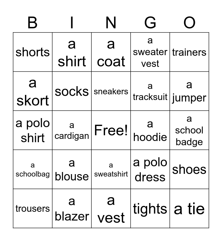 This bingo card has a free space and 24 words: a blouse, a blazer, sneakers, trousers, trainers, shorts, a skort, a shirt, a hoodie, a sweatshirt, a tracksuit, a polo shirt, a polo dress, shoes, socks, tights, a school badge, a coat, a jumper, a cardigan, a tie, a schoolbag, a sweater vest and a vest.