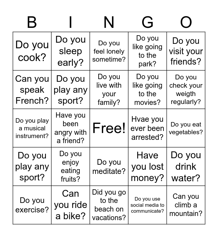 This bingo card has a free space and 24 words: Do you enjoy eating fruits?, Can you ride a bike?, Do you live with your family?, Do you exercise?, Do you visit your friends?, Do you cook?, Can you speak French?, Do you sleep early?, Hvae you ever been arrested?, Do you meditate?, Do you like going to the movies?, Do you play a musical instrument?, Have you lost money?, Do you drink water?, Do you play any sport?, Do you use social media to communicate?, Do you eat vegetables?, Do you feel lonely sometime?, Do you check your weigth regularly?, Have you been angry with a friend?, Can you climb a mountain?, Do you play any sport?, Do you like going to the park? and Did you go to the beach on vacations?.