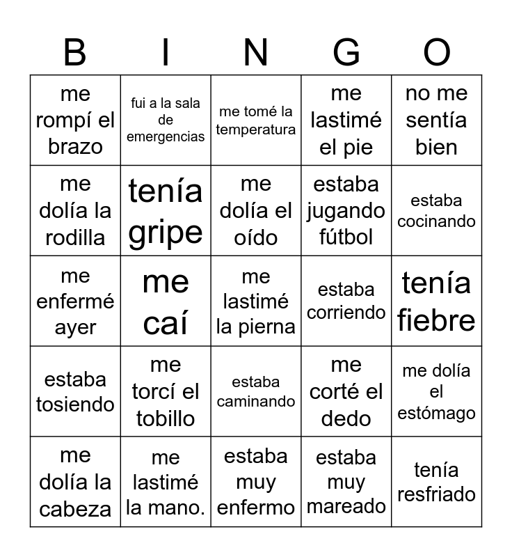 This bingo card has 25 words: me torcí el tobillo, estaba muy enfermo, me dolía el oído, me dolía la cabeza, no me sentía bien, me rompí el brazo, me dolía la rodilla, fui a la sala de emergencias, estaba corriendo, estaba caminando, estaba jugando fútbol, me enfermé ayer, me corté el dedo, me dolía el estómago, tenía gripe, tenía resfriado, tenía fiebre, me tomé la temperatura, estaba cocinando, me caí, me lastimé la pierna, me lastimé la mano., estaba tosiendo, me lastimé el pie and estaba muy mareado.