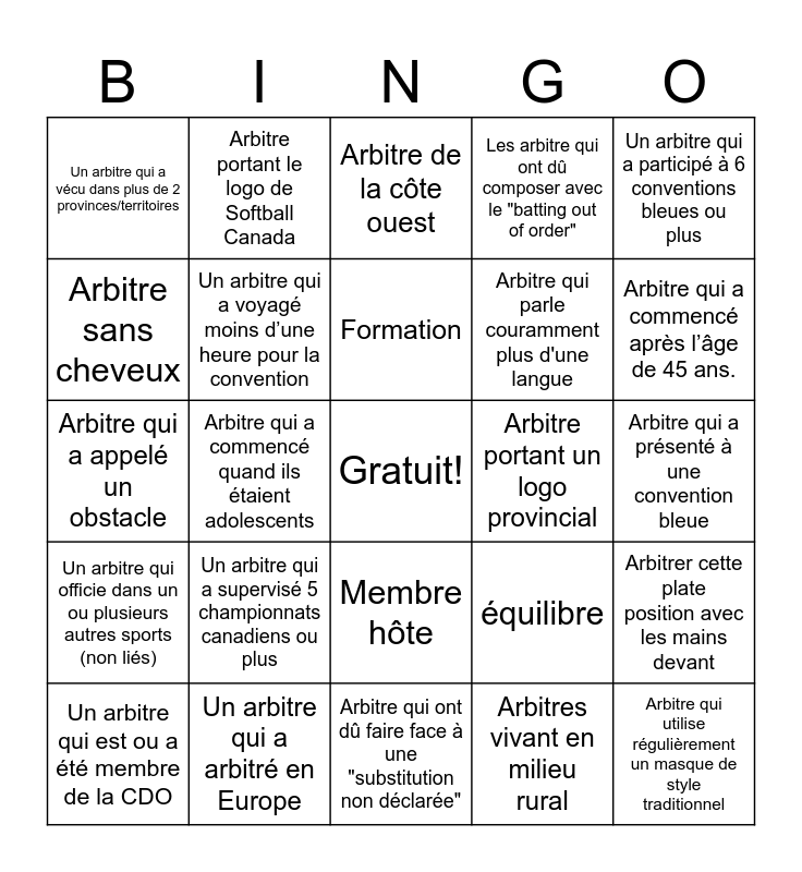 This bingo card has a free space and 24 words: Un arbitre qui a supervisé 5 championnats canadiens ou plus, Un arbitre qui a arbitré en Europe, Formation, Un arbitre qui est ou a été membre de la CDO, Un arbitre qui a participé à 6 conventions bleues ou plus, Un arbitre qui a vécu dans plus de 2 provinces/territoires, Arbitre sans cheveux, Arbitre portant le logo de Softball Canada, Arbitre portant un logo provincial, Membre hôte, Arbitre qui parle couramment plus d'une langue, Arbitre qui a appelé un obstacle, équilibre, Arbitrer cette plate position avec les mains devant, Un arbitre qui a voyagé moins d’une heure pour la convention, Arbitres vivant en milieu rural, Arbitre qui a présenté à une convention bleue, Arbitre de la côte ouest, Arbitre qui a commencé après l’âge de 45 ans., Arbitre qui a commencé quand ils étaient adolescents, Arbitre qui utilise régulièrement un masque de style traditionnel, Un arbitre qui officie dans un ou plusieurs autres sports (non liés), Les arbitre qui ont dû composer avec le "batting out of order" and Arbitre qui ont dû faire face à une "substitution non déclarée".